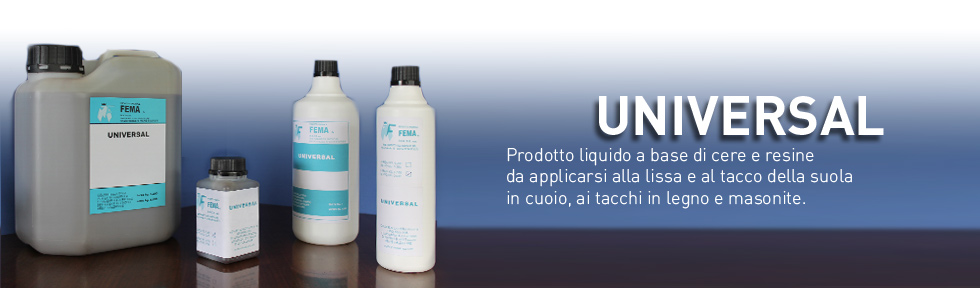 Universal è un prodotto liquido a base di cere e resine da applicarsi alla lissa e al tacco della suola in cuoio, ai tacchi in legno e masonite.